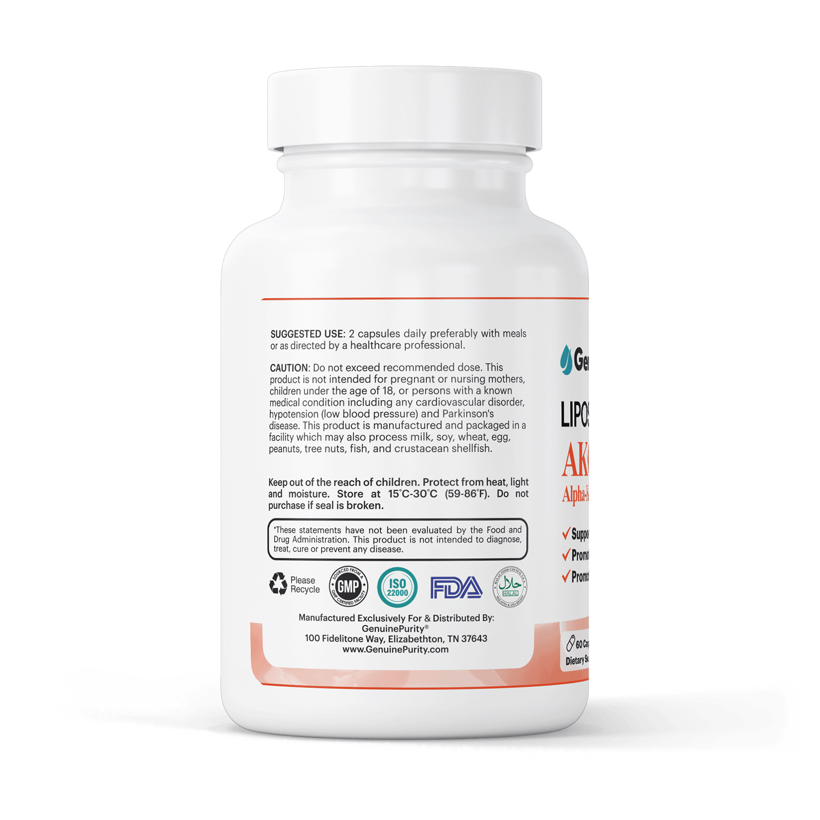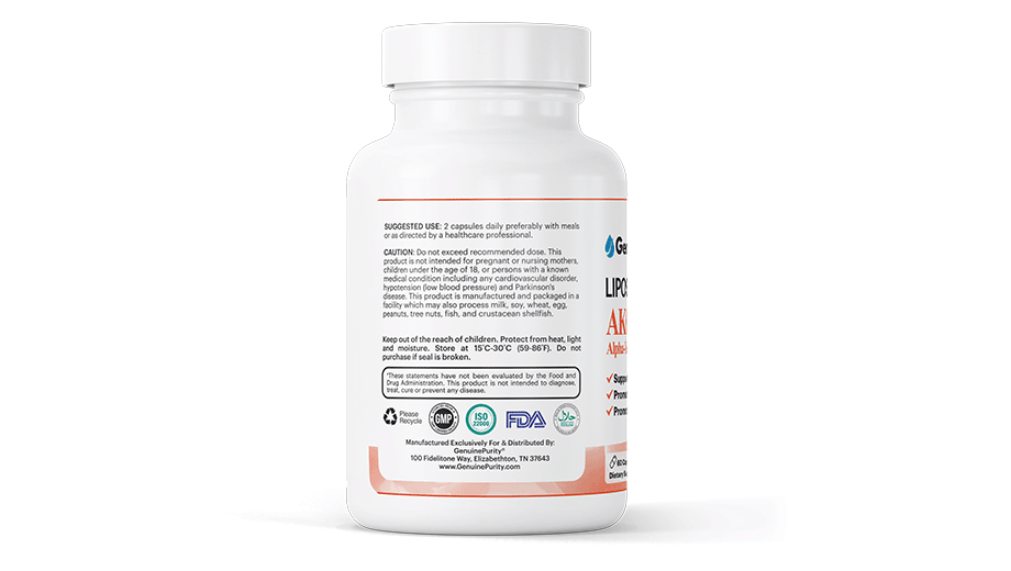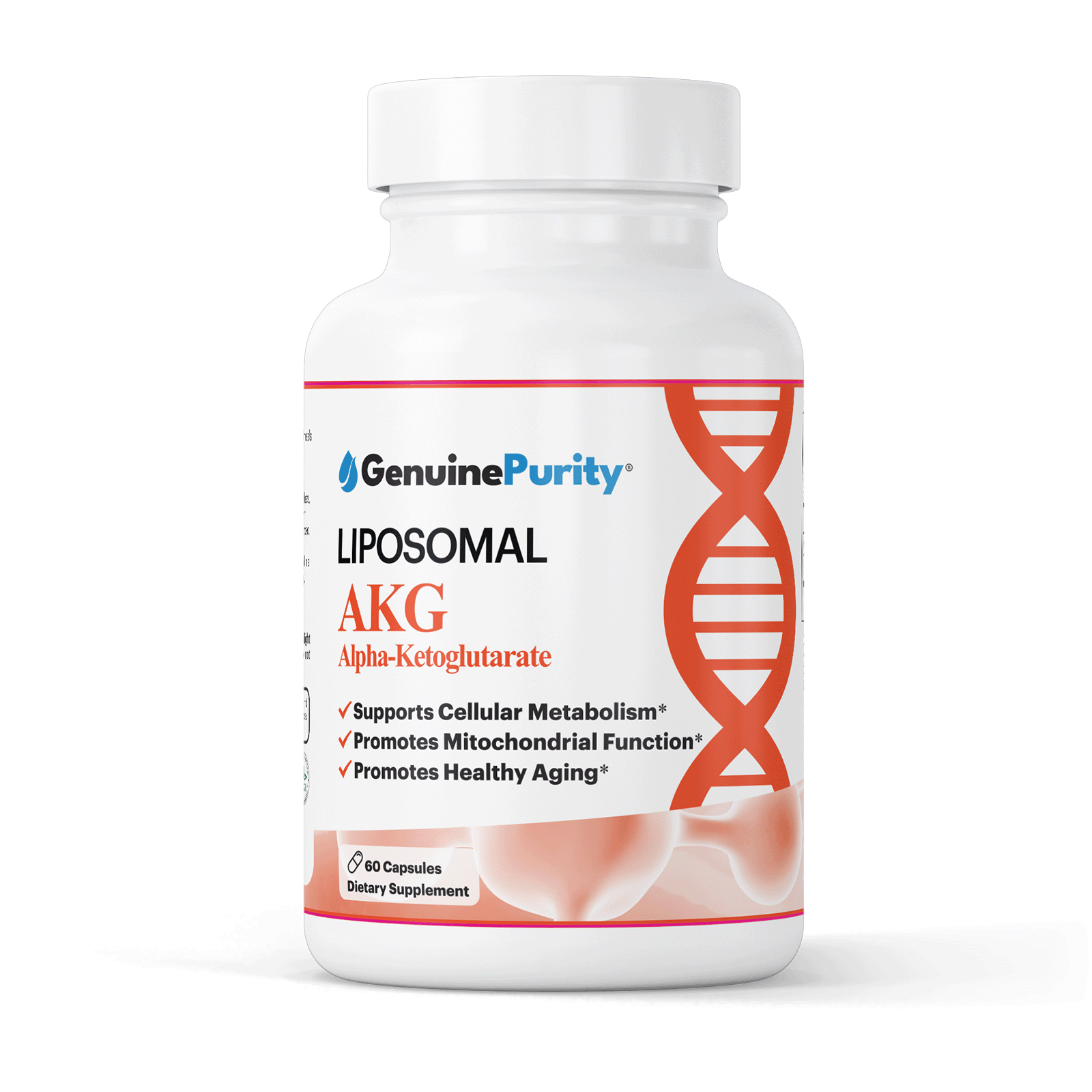 GenuinePurity® Liposomal AKG provides 1,000 mg of Calcium Alpha-Ketoglutarate per serving, delivered in a plant-derived phospholipid system designed to promote stability and absorption.