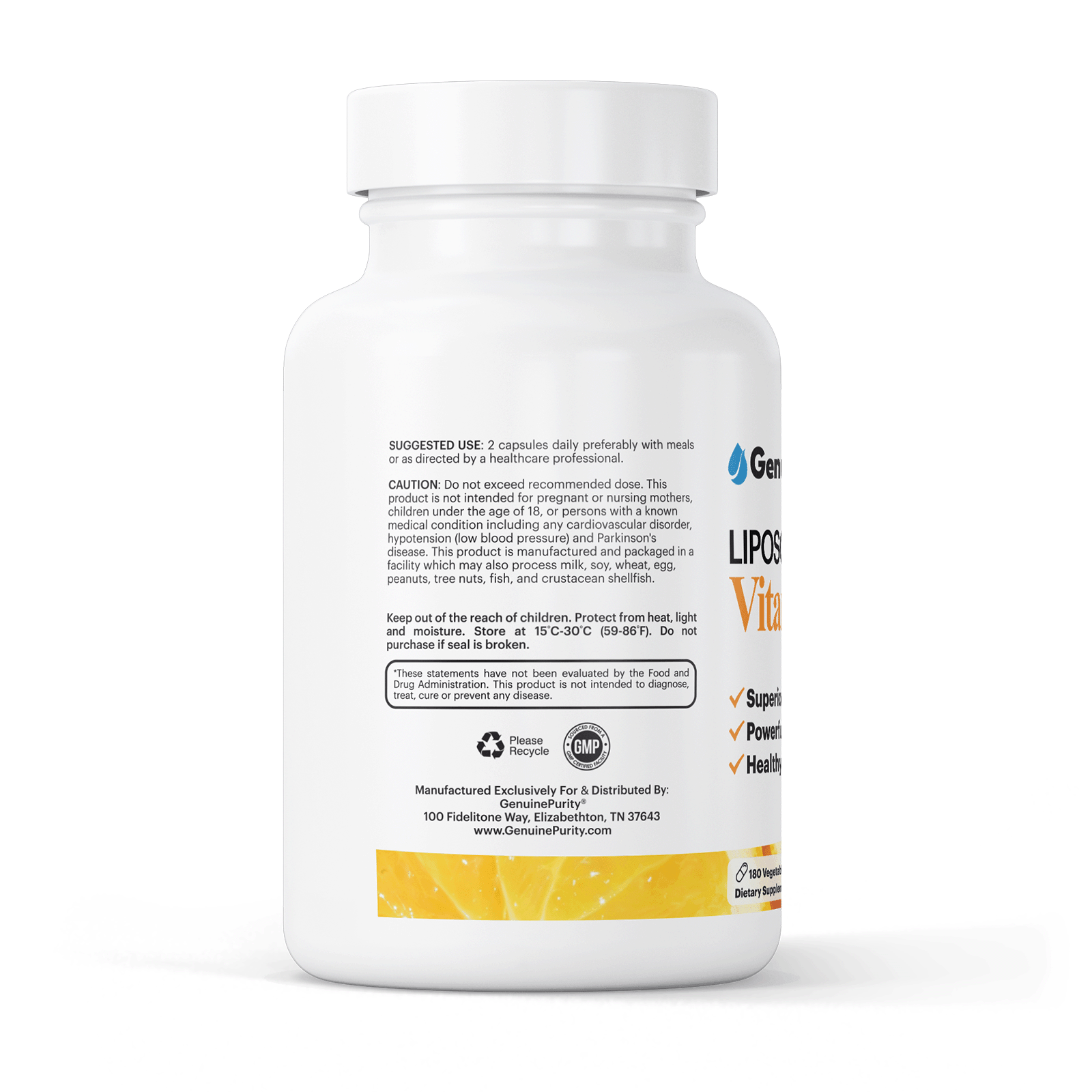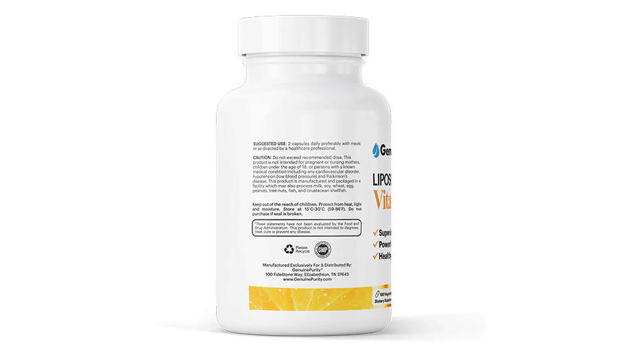 GenuinePurity® Liposomal Vitamin C is made in the USA in cGMP-certified facilities. Each batch undergoes rigorous third-party testing to ensure purity, potency, and safety.