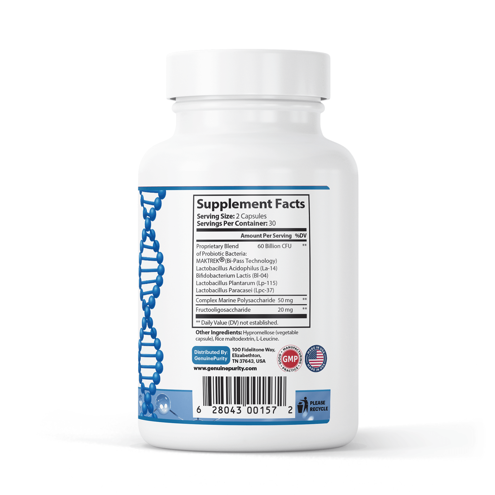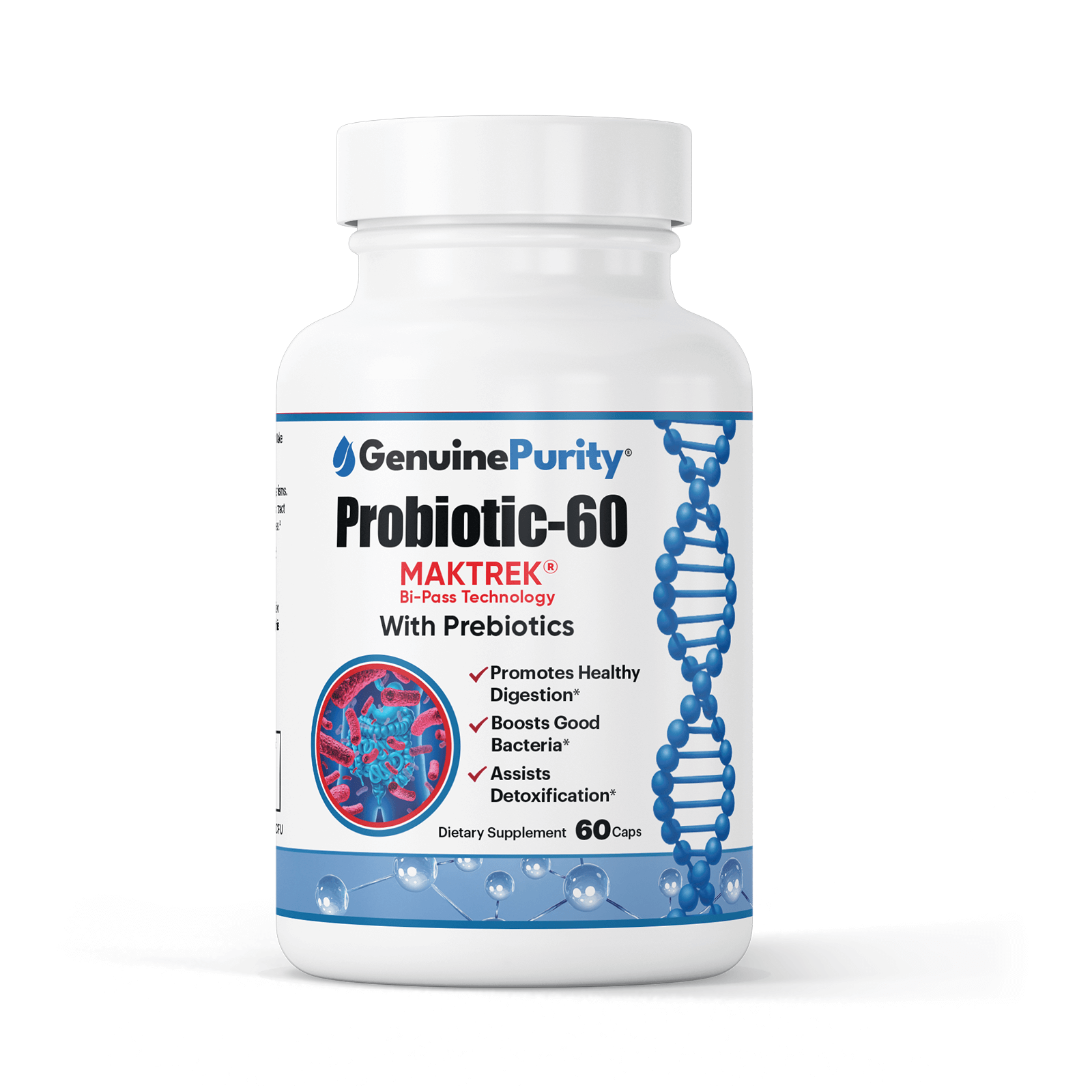 GenuinePurity® Probiotic-60 contains a high-potency blend of clinically researched probiotic strains formulated to work together for enhanced digestive, immune, and microbiome support.